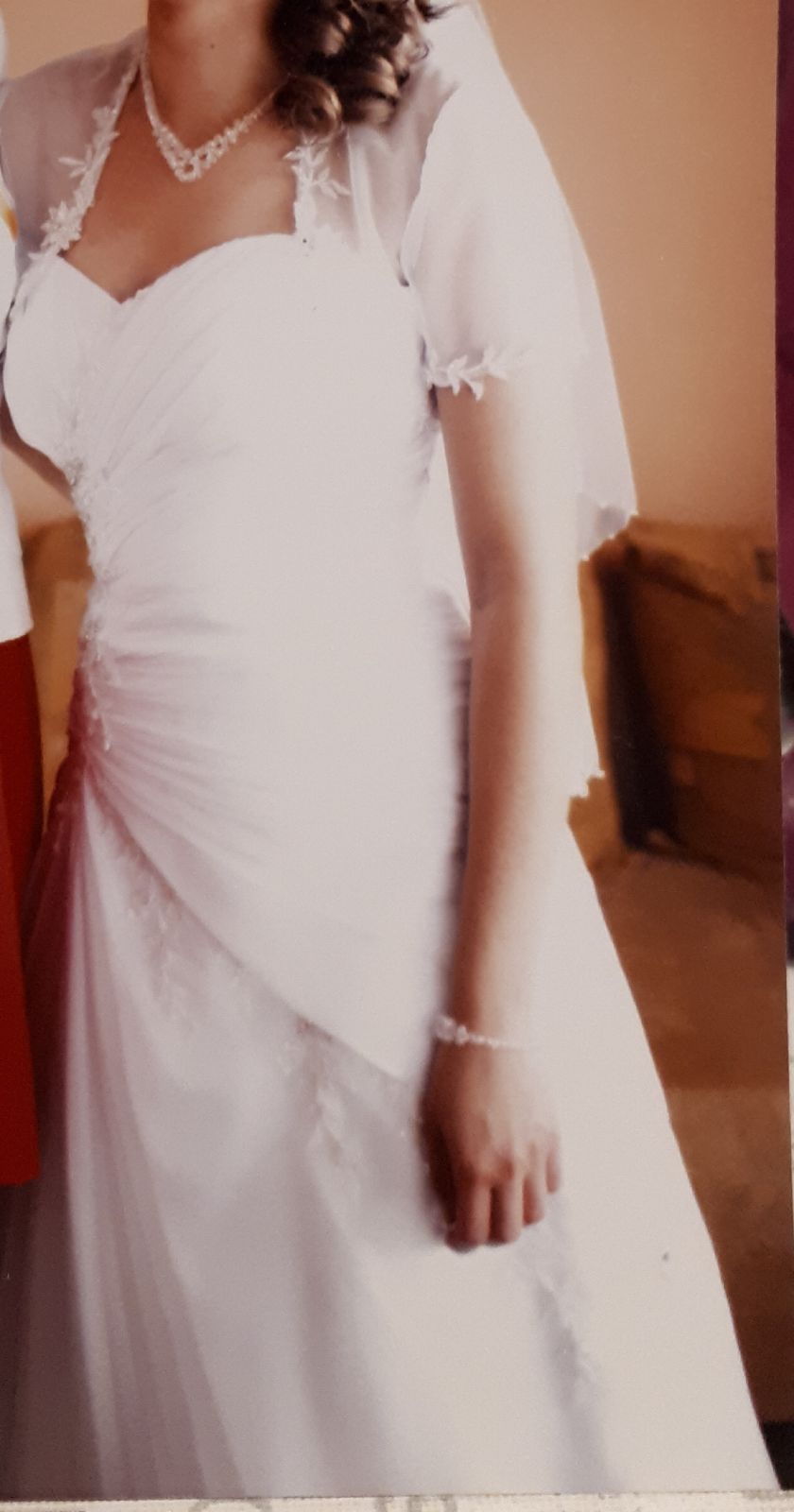 Suknia Ślubna w rozmiarze 38/40 Wzrost 172 plus 2 cm obcas. Biust 93D. Kupiona w salonie Duber model 1211 kolor biały. Wyczyszczona w pralni chemicznej. Do sukni dołącząm bolerko z wzorem takim jak na sukni oraz welon. Suknia jest wiązana na plecach także łatwo dopasuje sie do kazdego kształtu ciała i biustu. Polecam.