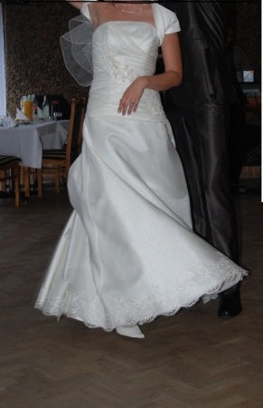 Sprzedam piękną suknię ślubną.Rozmiar 38. Obwód talii 74-78 cm. Wzrost 170 cm+ 4 cm obcas. Kolor ecru, delikatnie błyszcząca- wierzchnia warstwa sukni wykonana jest z organtyny. Jest wyjątkowa ze względu na piękny tren wykończony śliczną koronką! Koronkowe aplikacje znajdują się również na gorsecie! Z tyłu wiązana. Cena- 1200 zł