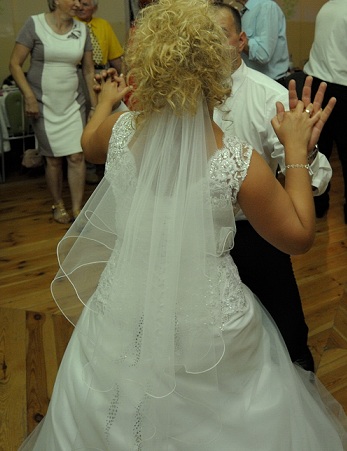 Suknia po czyszczeniu w profesjonalnej pralni. Stan bardzo dobry. GRATIS: podwiązka oraz welon z delikatnymi wzrokami z kryształków.