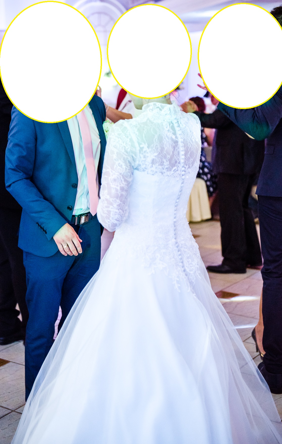 Suknia koloru śnieżnobiałego, wykonana jest z przepięknej koronki oraz tiulu. Założona tylko raz na własny ślub. Przepięknie układa się w tańcu, do sukni dołączona jest halka z kołem.