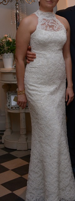 Sprzedam elegancką koronkową suknię ślubną. Pasuję zarówno na ślub kościelny, jak i cywilny. Na plecach koronkowe ozdobne ramiączka, przepiękna miła w dotyku koronka. Wokół szyi mini golfik-choker.