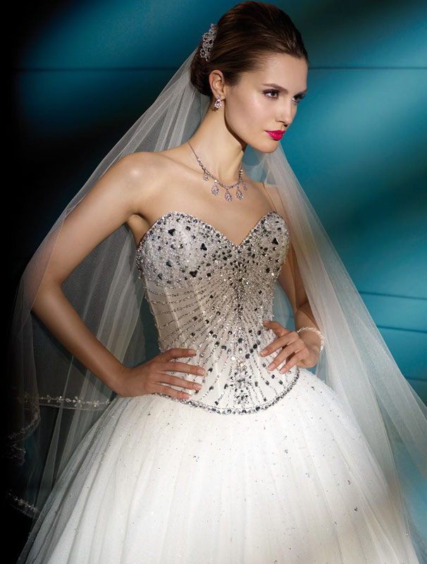 Jest to klasyczna suknia wykonana z bogato ozdobionego tiulu. Wytworna i elegancka.