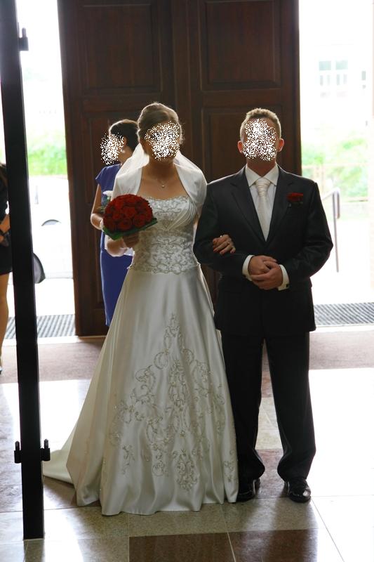 Suknia jest przepięknie haftowana, w świetle dziennym mieni się i błyszczy.