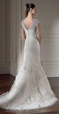 Suknia tworzy jedną całość: góra dopasowana z pięknie wykończonymi ramionami, dół zdobi efektowny tren.Całość unosi się na tiulu dzięki czemu przepięknie się układa i nie ogranicza ruchów.
