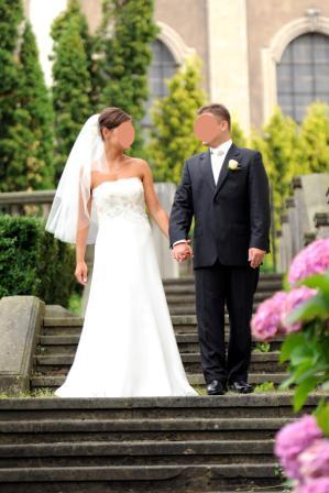 Elegancka, kobieca i romantyczna suknia ślubna w kolorze ecru. Rozmiar -38. Suknia jednoczęściowa z podpinanym trenem. Góra wykończona starą koronką wyszywaną perłami. Dół to zwiewny muślin. Warstwy tiulu wszyte bezpośrednio w halkę (brak koła). Suknia zapinana z tyłu na kryty zamek. Stan sukni bardzo dobry. W cenę wliczony jest welon – półdługi, podobnie jak suknia elegancki i klasyczny. Więcej zdjęć mogę wysłać na maila.