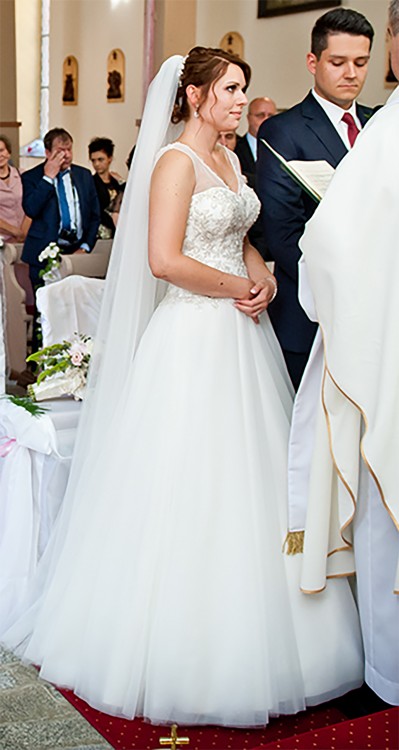 W cenie jest również długi i gęsty welon oraz zakładane pod gorset bolerko, wykonane z tego samego tiulu co suknia.