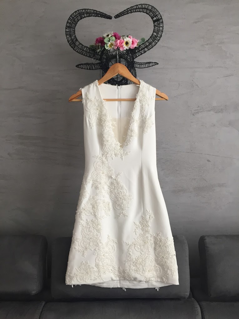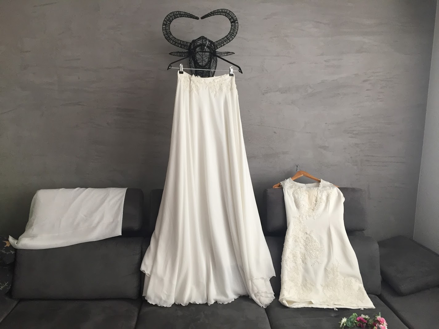Krótka sukienka jest uszyta z rozciągliwego i bardzo wygodnego materiału wyglądającego jak atłas, długa z podszewką i 3 warstwami tiulu, z lekkim trenem (nie przeszkadza w chodzeniu). Zamek niewidoczny, długa spódnica zapinana na zatrzaski.