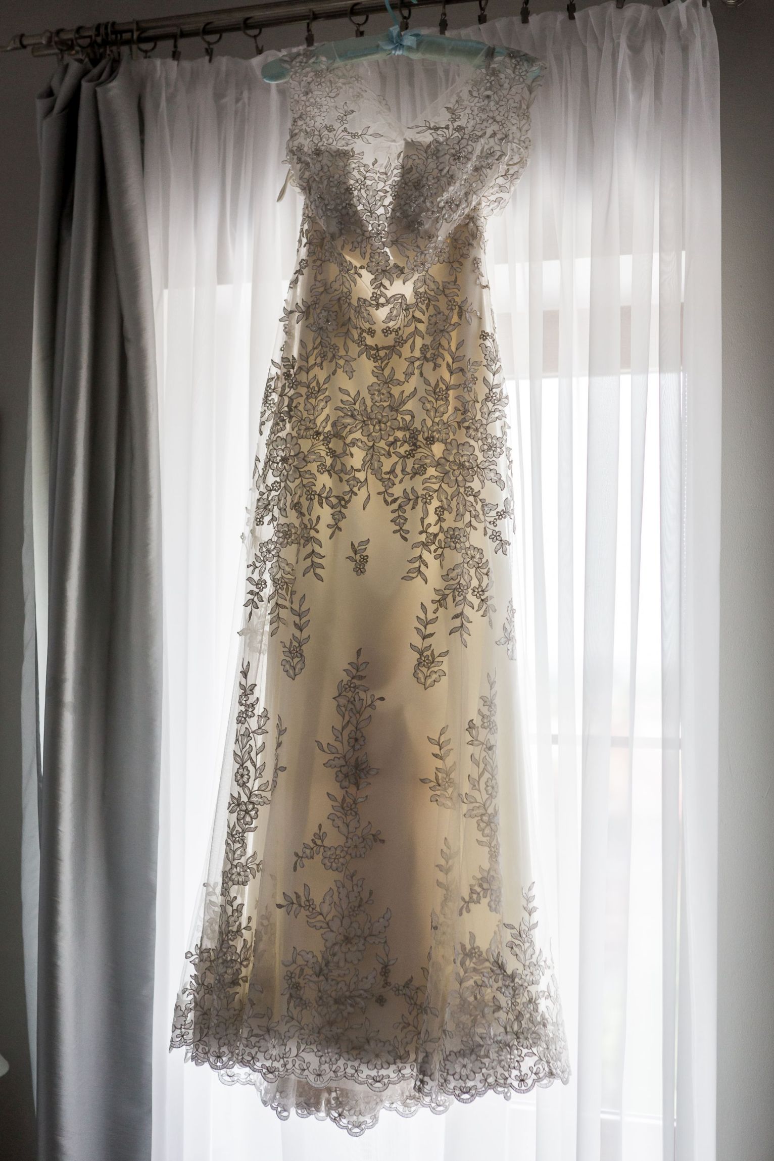 Dolna warstwa to satynowa halka, w kolorze szampańskiej bieli, z wyciętymi plecami. Wierzchnia warstwa z pięknego srebrzysto-białego tiulu z koronką z kwiatowymi wzorami i rozsianymi koralikami. Plecy są odkryte, przesłonione cieniutką warstwą tiulu, z delikatnie przesłaniającymi koronkami.
