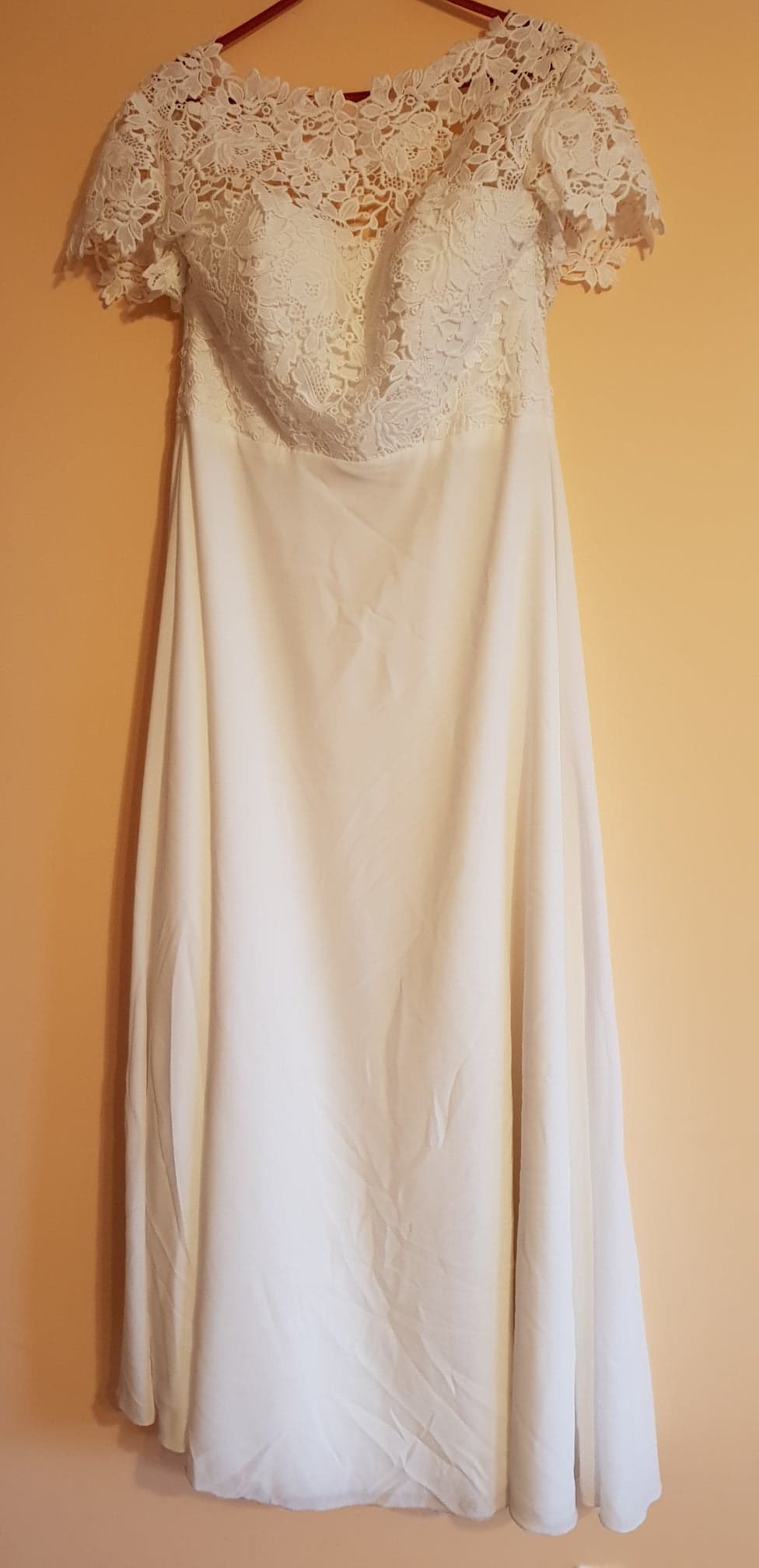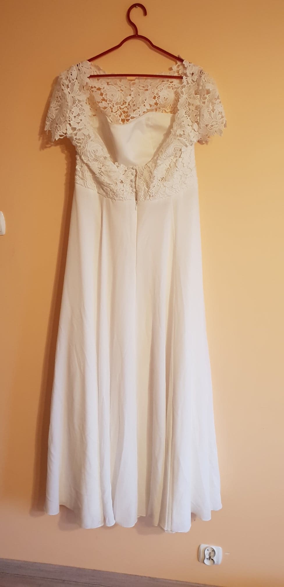 Suknia jest śnieżnobiała,lejąca. Od pasa w dół wykonana jest z jedwabiu muślinowego natomiast góra sukienki to koronka z gipiury. :)