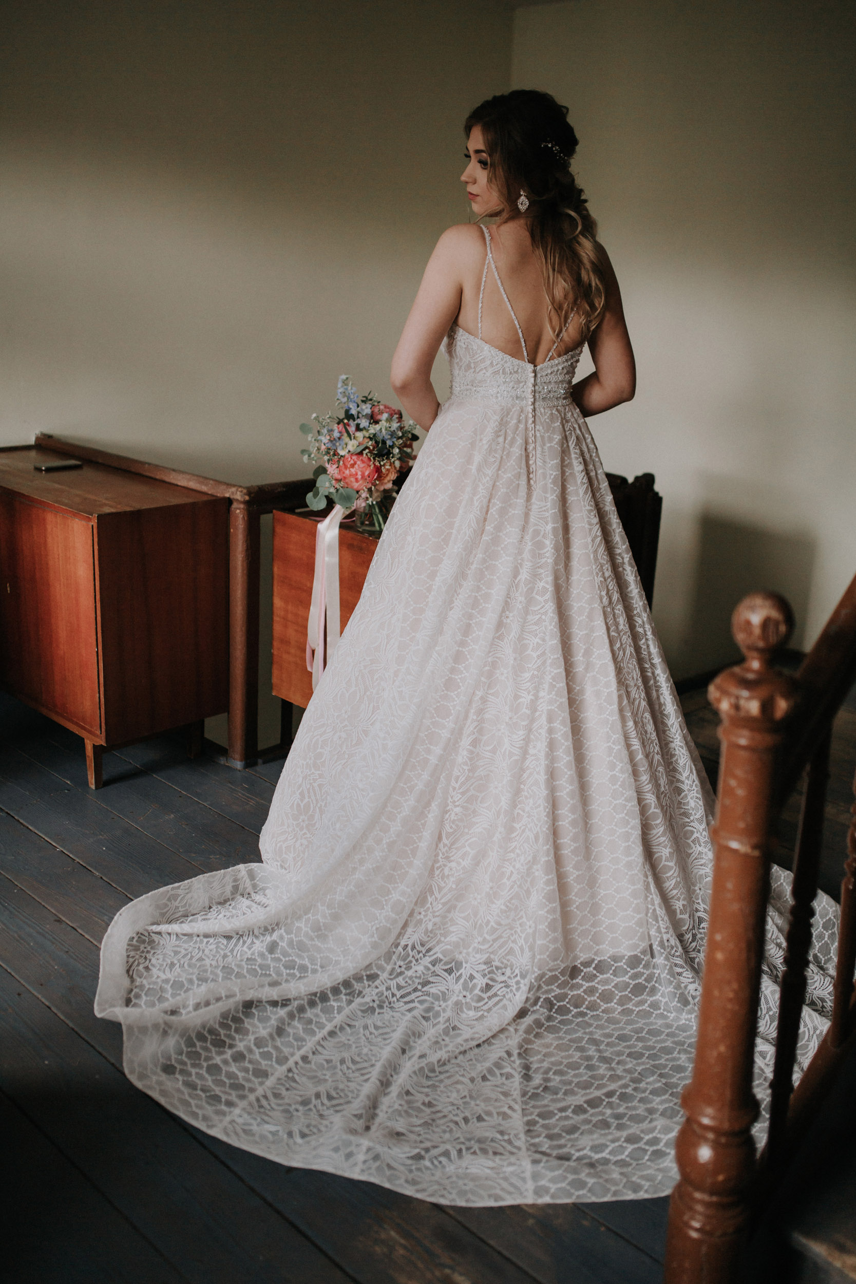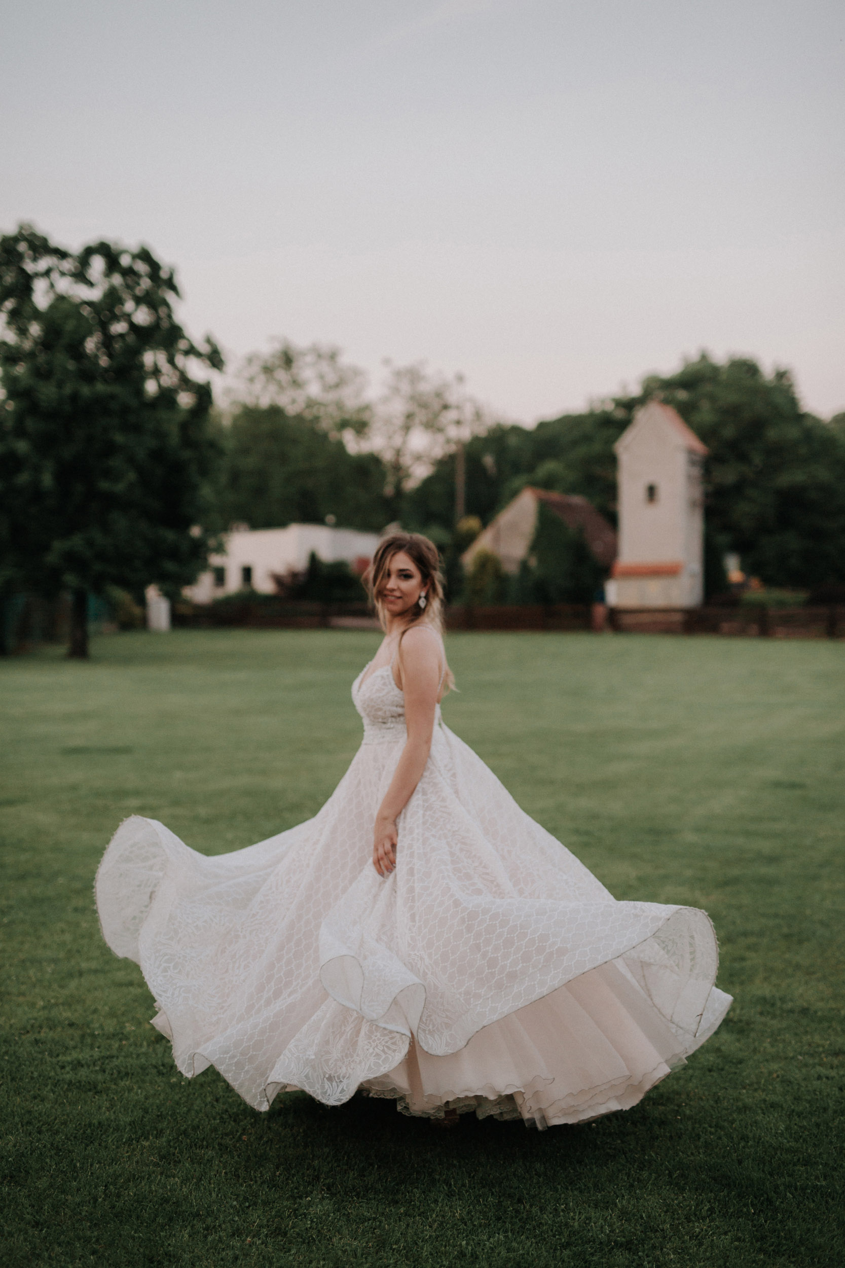 Suknię na sobie miałam do godziny 21, po tym czasie przebrałam się na drugą. Nie jest zniszczona, nie ma żadnych ubytków, nie została nigdzie zaciągnięta. Po ślubie – została dana do czyszczenia w salonie w którym została zakupiona, a także zostały doszyte brakujące kryształki pod pachami.