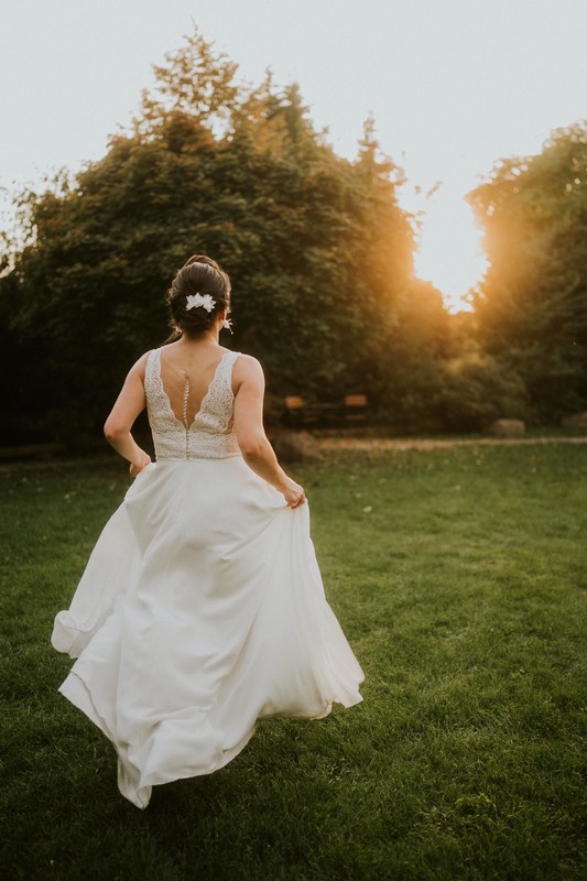 Piękna, delikatna suknia ślubna z kolekcji Annais by Ola La, szyta na miarę, łączona z dwóch modeli: