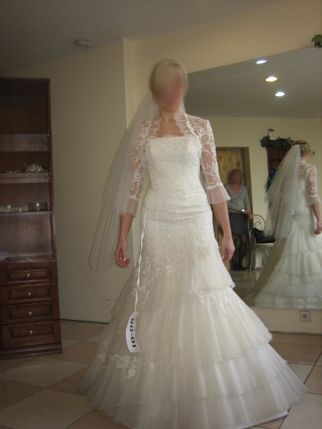 ślubnych Agora we Wrocławiu w 2010 roku ( http://www.modaslubna-agora.pl/kolekcje.html model 10-08). Suknia jest biała, jednoczęściowa, ozdobiona kryształkami Swarowskiego, z tyłu delikatnie dłuższa, zapinana częściowo na zamek, a częściowo sznurowana, przez co łatwo można ją poszerzyć lub zwęzić. Welon również zdobiony kryształkami. Bolerko z aplikacjami takimi samymi jak na sukni. Suknia w rozmiarze 38-40, użyta była tylko raz, po czym została profesjonalnie wyczyszczona. Jest w idealnym stanie. W razie pytań proszę o kontakt. Na życzenie mogę wysłać więcej zdjęć. Suknię można przymierzyć we Wrocławiu. Cena: 1700 do negocjacji. Kontakt: 696459622
