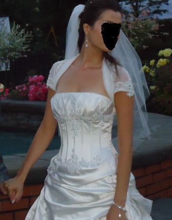 Witam na mojej aukcj oryginalnej,satynowej sukni w kolorze Ivory (Perła), z gorsetem w stylu Baskijskim, który ma sznurowane plecy.