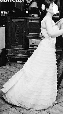 Mam do sprzedania suknię jednoczęściową, leciutką, bardzo wygodną. Na całej długości znajdują się delikatne falbanki z organzy. Gorset jest lekko usztywniany zdobiony haftem i delikatnymi kamykami dzięki czemu pięknie modeluje sylwetkę.