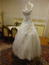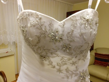Mam do sprzedania przepiękną suknię ślubną, wykonaną z atłasu pokrytego tiulem. Suknia jest śnieżnobiała, posiada śliczne srebrno-kryształowe zdobienia w postaci kwiatków i listków, jest wiązana z tyłu co daje możliwość regulacji rozmiaru (36-40) i efekt wyszczuplenia. Suknia jest rozszerzana ku dołowi, posiada halkę zakończoną kołem. Suknia kupiona z salonu jako nowa, ubrana tylko raz, przygotowana do wyczyszczenia. Cena w salonie wynosiła 3000 zł. NAPRAWDĘ WARTO, SERDECZNIE POLECAM.