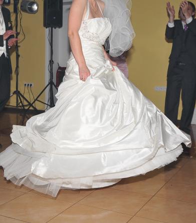 Suknia jest na kole, dzięki czemu ładnie się układa, materiał tafta z lekkim połyskiem, rozm. 36, wymiary: