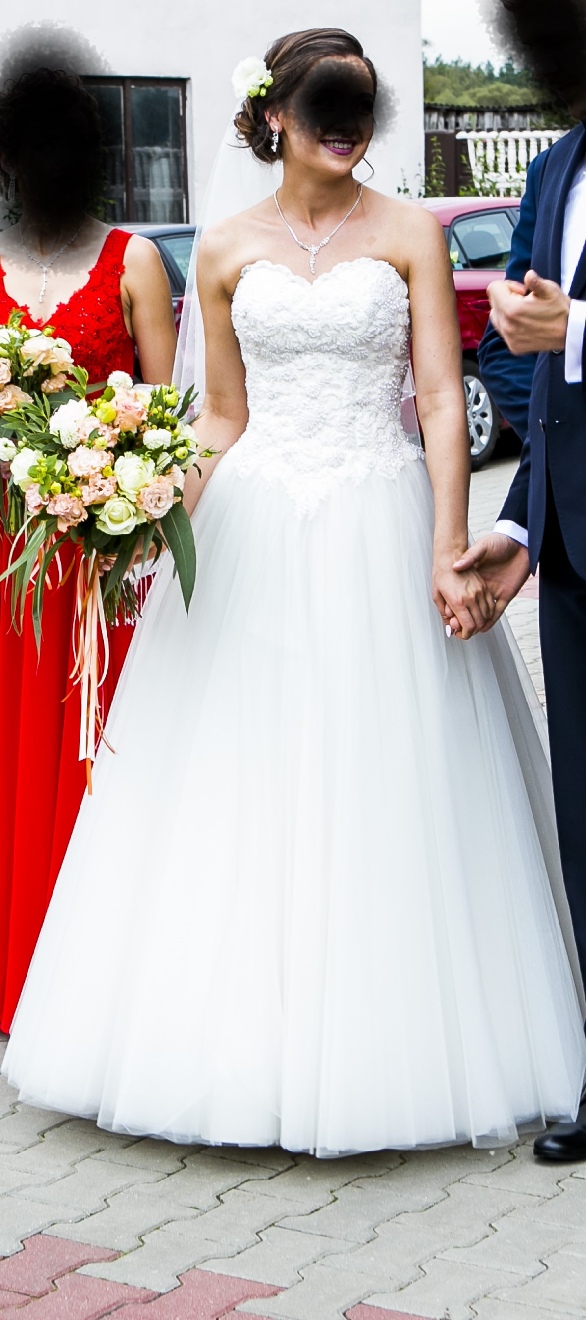 sprzedam suknię ślubną firmy Agnes, model: Ka 16009 w kolorze ivory (kość słoniowa). Suknię kupiłam nową- z salonu, była użyta tylko raz. Jest niezniszczona, profesjonalnie wyczyszczona i gotowa do użycia. Suknia szyta na miarę , na wzrost 169cm + ok 9cm obcasy. Rozmiar 36-38. Suknia jest z tyłu sznurowana plus zamek, można ją łatwo dopasować w tali . Do sukni dołączam delikatny welon. Dekolt w kształcie serca.