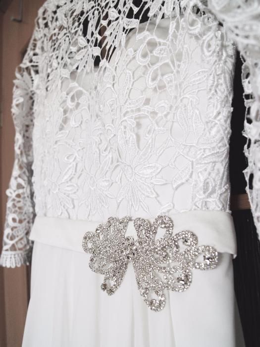 Góra z pięknej gipiury, dół muślinowy z rozcięciem spódnicy i doczepianym na przezroczyste zatrzaski trenem, inspirowana suknią Mabell Violi Piekut.