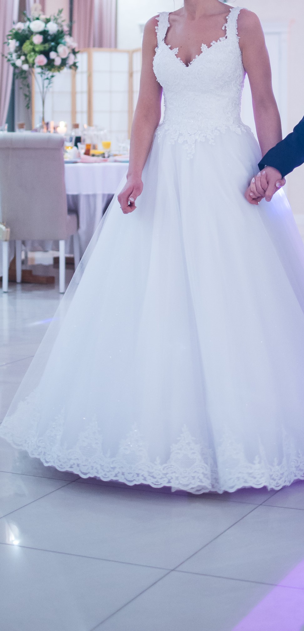 Sprzedam piękną śnieżnobiałą suknię ślubną w rozmiarze 36. suknia w kształcie litery A. Gorset jest regulowany, także da się zmniejszyć lub powiększyć do rozmiarów XS-S-M. Zakupiona w salonie sukien ślubnych w Bydgoszczy. Posiadam umowę zakupu (do wgladu). Szyta na wzrost 167 cm + 7 cm obcas. Bardzo wygodna, nie ogranicza ruchów. Góra uszyta z delikatnie mieniącej się koronki, natomiast dół z lekkiego tiulu, warstwa mieniąca się, całość wykończona koronką. Suknia wiązana. Dokładne wymiary mogę podać w wiadomości prywatnej.