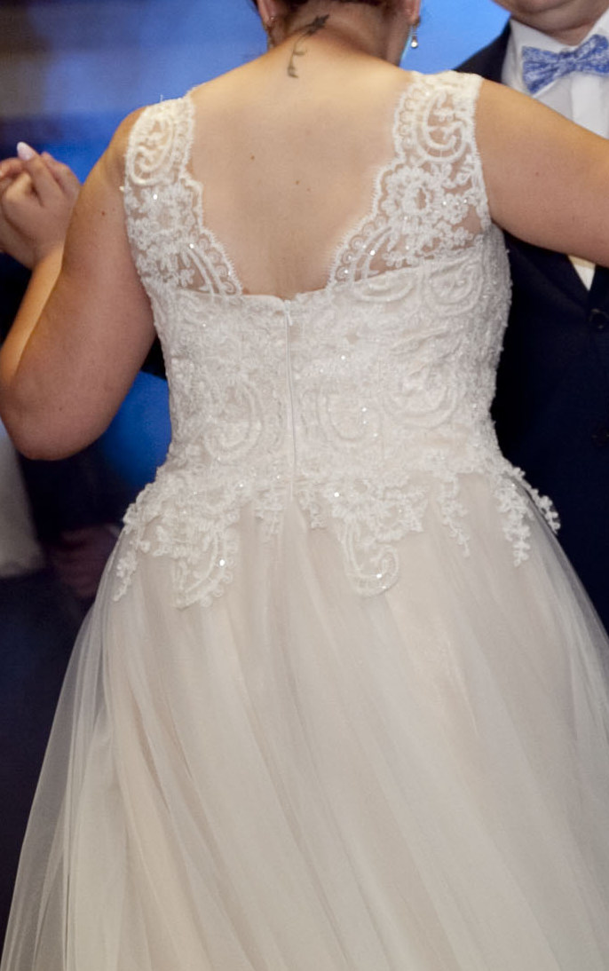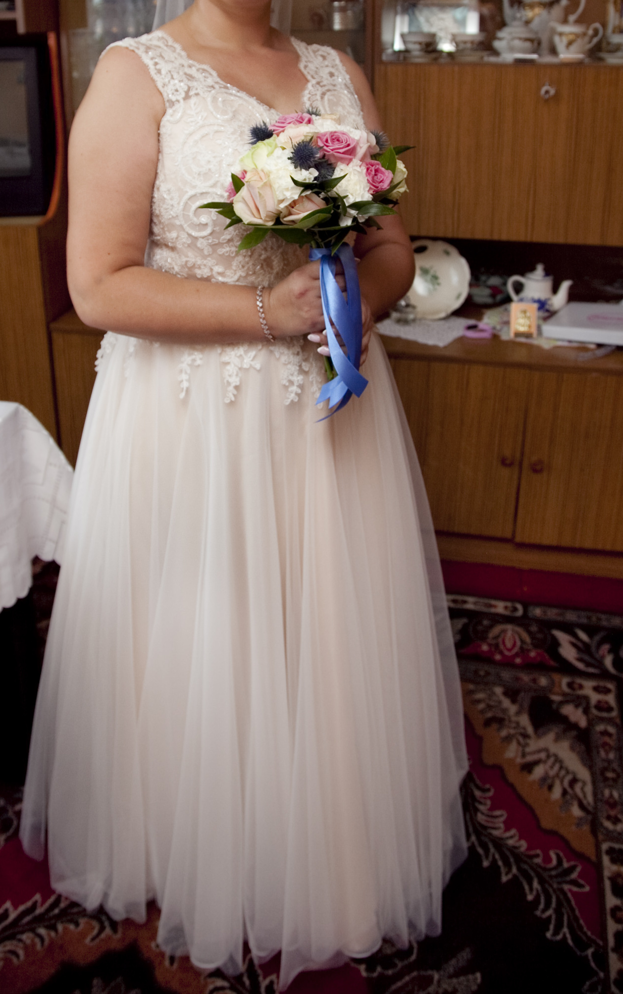 Mam do sprzedaż suknie ślubną w kolorze beżowym, w kształcie litery A,szyta na miarę na wzrost 164 cm+ niski obcas. Suknia jest lekka, nie krępuje ruchów i jest bardzo wygodna. Posiada bogate zdobienia oraz opadające aplikacje które wysmuklają sylwetkę.
