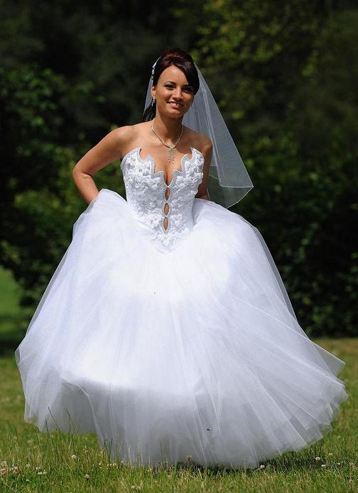 Suknia jest jednoczęściowa sznurowana z tyłu ( możliwość regulacji rozmiaru). Góra sukni jest gorsetowa z seksownym rozcięciem między biustem ozdobiona oryginalnymi małymi kwiatkami oraz kryształkami swarovskiego, które mieniąc się dają niesamowity efekt wizualny. Dół sukni uszyty jest z kilku warstw tiulu (plus halka z dwiema warstwami), które dają sukni lekkości i niepowtarzalnego uroku. Suknia jest bardzo lekka i wygodna.