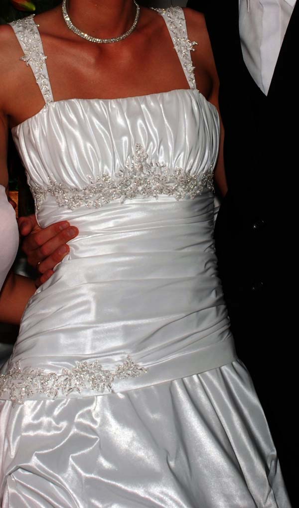Suknia jest w kolorze białym, jednoczęściowa, rozmiar 38, wzrost 175cm. Uszyta jest z wysokiej jakości tafty ( tzw. tafty inteligentnej). Suknia jest wygodna i bardzo elegancka. Górę sukni zdobi koronka w kolorze platyny, która ładnie się mieni. Fason doskonale podkreśla biust. Ramiączka zdobione są koronką w kolorze platyny. Dół sukni jest drapowany, na dole przyozdobiony jest również koronką w kolorze platyny. Suknia została profesjonalnie wyczyszczona i nie ma śladów użytkowania.