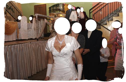 Jest dopasowana w talii i rozchodzi się w fasonie "A" (bez trenu). Gorset wiązany z tyłu ,dzięki czemu świetnie dopasowuje się do sylwetki. W komplecie do sukienki jest halka nakole,białe bolerko z krótkim rękawem oraz buty ślubne w rozm.39.