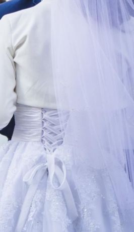 Tył sukni wiązany dzięki temu w trakcie przygotowań można przytyć lub też schudnąć.
