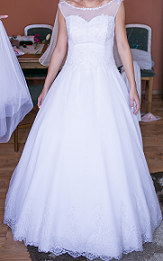 Sprzedam suknię ślubną w stylu księżniczki. Gorset ręcznie wyszywany, który dodatkowo podkreśla biust i wyszczupla talię (tył sznurowany). Dół sukni zdobiony szeroką koronką również ręcznie wyszywaną.