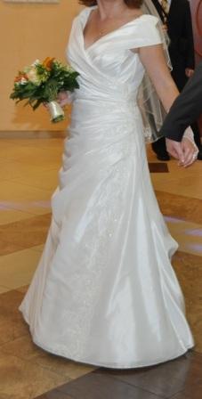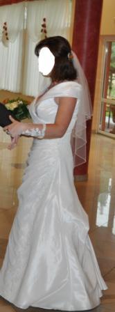 Sprzedam elegancką i bardzo wygodną suknię ślubną z satyno-tafty w kolorze śmietankowym z aplikacjami z pięknej hiszpańskiej koronki. Suknia ma chowany tren i jest na wygodnym kole, rękawy mogą być opuszczane na ramiona, bądź podniesione. Dodatkowo welon i rękawiczki z aplikacjami jak na sukience. Polecam Pannom Młodym o nieco bujniejszych kształtach, bo wygląda super smukło.