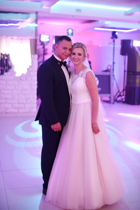 Efektowna suknia ślubna, Góra z pięknej francuskiej koronki w kolorze ecru. Dół blado różowy, wpada w delikatna brzoskwinię. Góra z tyłu w litere V, zakończona guziczkami oraz piękna odpinana kokardą. Suknia jest lekka, nie zmeczylam się tańcząc do 6 rano. Posiadam do niej koło, co daje efekt sukni w literę A oraz 2 welony. Jeden welon długi, idealny do kościoła, ciągnie się po ziemi. Drugi krótki, na salę, delikatny i lekki. Suknia ma odpinany tren, pięknie się go przypina do sukni.