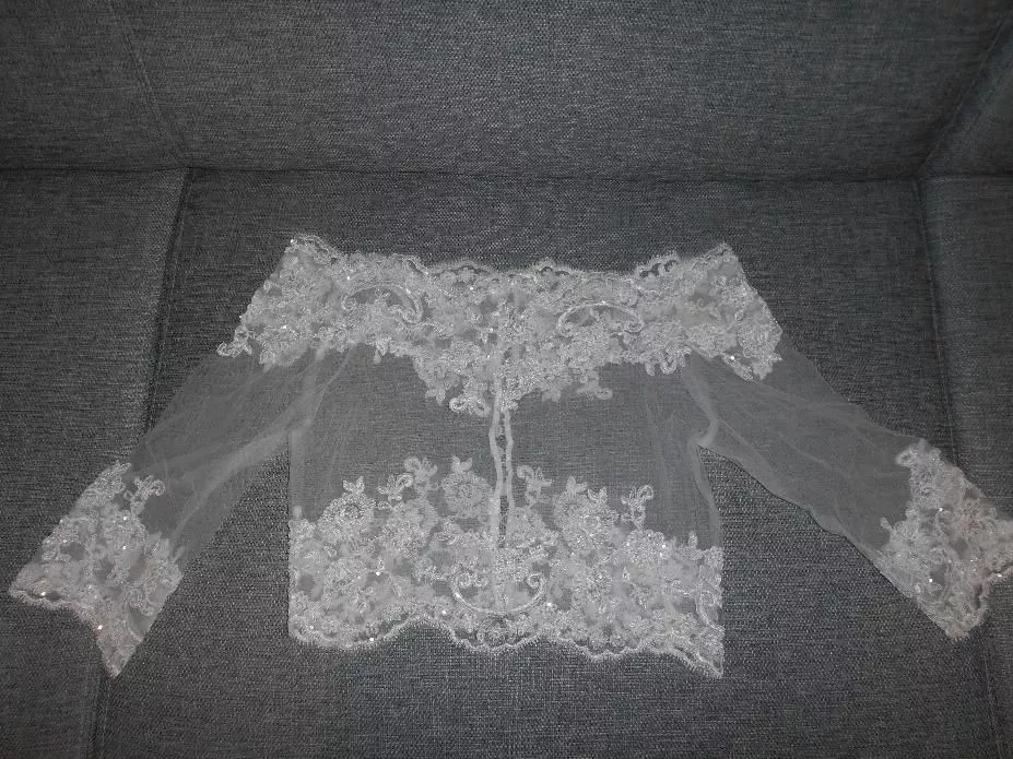 Z całego serca muszę przyznać,że jest bardzo wygodna, całą noc w niej wytrzymałam bez marudzenia :) Gorset sukni jest regulowany z tyłu, na przodzie oraz z boku ma koronkę z kryształkami, perełkami i cekinami . Dodatkowo do sukni dołączam: welon ( wykończony cekinami na dole ), koło, koronkowe bolerko oraz ozdobę do włosów:)