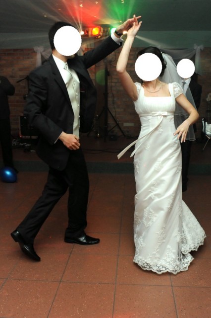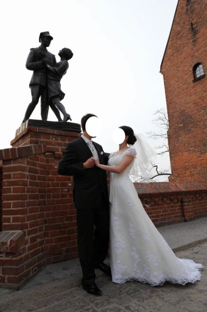 Suknia jest prosta i elegancka, lekka, typ: "józefinka" z trenem (z możliwością łatwego podpięcia na guziczek).