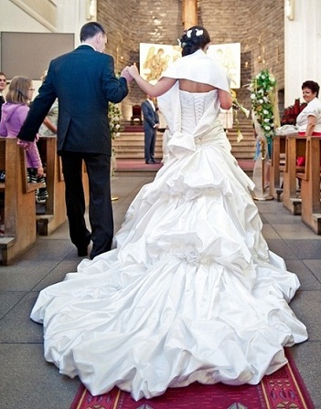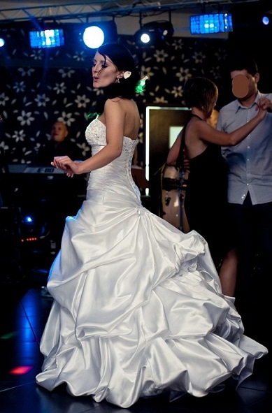Dodatki: halka, welon wyszywany koralikami (nowe), rękawki (nowe), podwiązka (nowe), szeroki satynowy szal