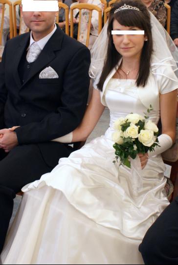 założoną tylko raz, po czyszczeniu, suknia składa się z dwóch części: gorset na górze zdobiony różyczkami dopasowujący się do sylwetki oraz spódnicy na lekkim kole. Dodatki tj.: welon, rękawiczki dokładam gratis. Posiadam również buty, które idealnie pasują do sukienki.