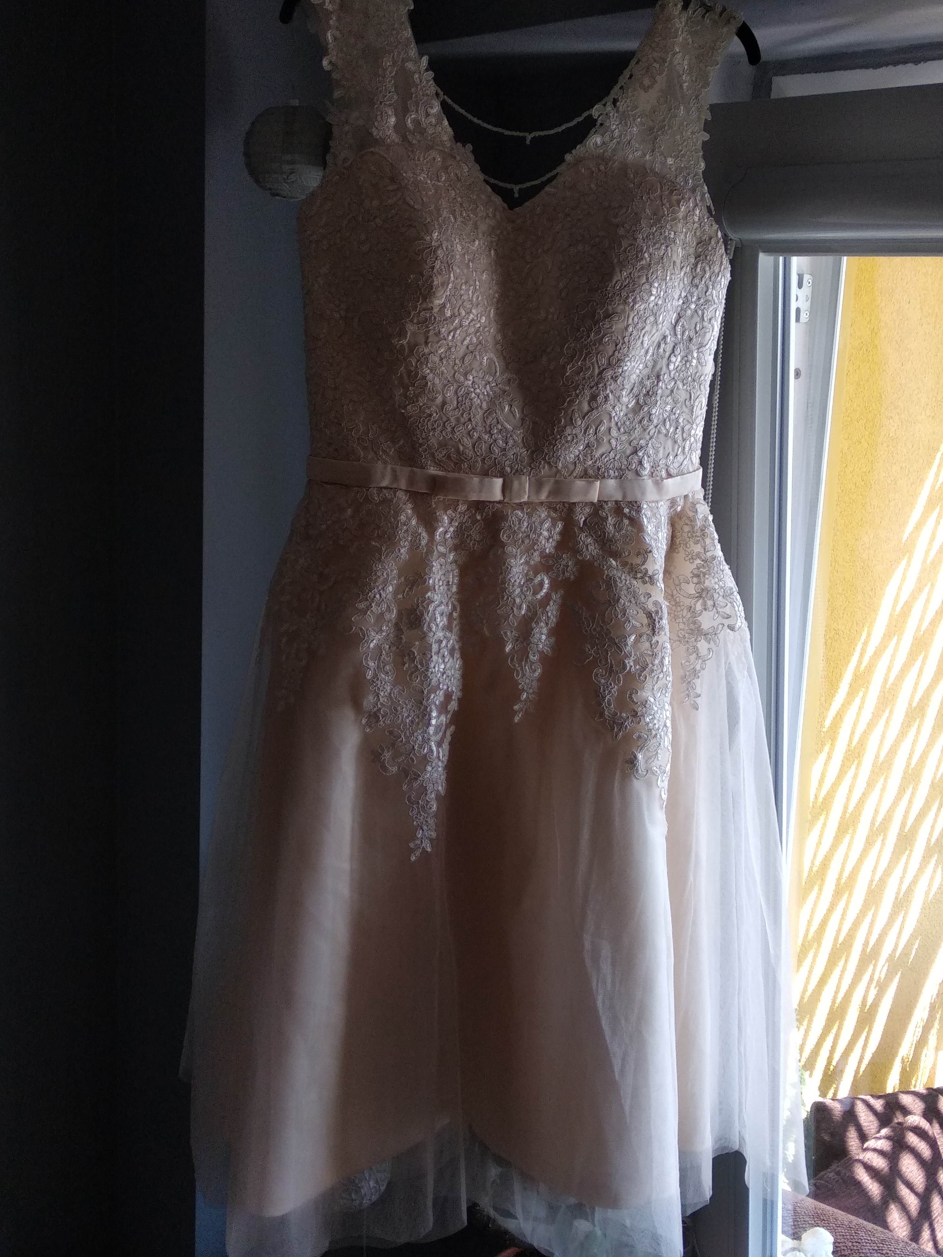 Sukienka nowa, nie używana. Zamówiona na wesele, które nie doszło do skutku. Szkoda ja zamykać w szafie i czekać na okazje, by ją założyć. Polecam. Z podszewką, solidnie wykonana.