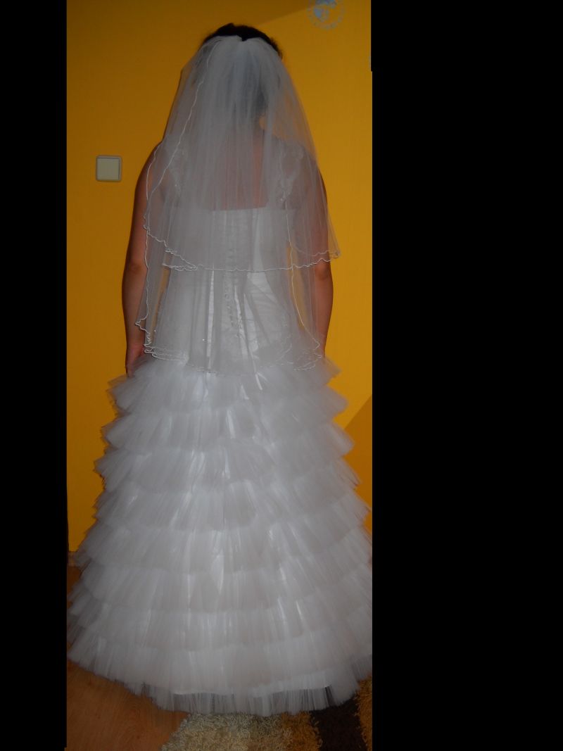 Sprzedam suknie ślubną z tyłu zawiązywaną czyli jest możliwość regulacji rozmiaru, biała, niezniszczona, śliczna, ramiączka z koronki, do kompletu welon, bolerko,halka z kołem.