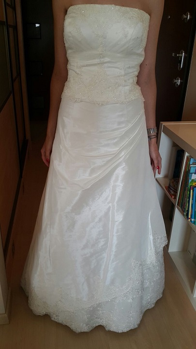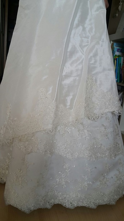 Dół sukni wykończony po skosie koronką i błyszczącymi koralikami.
