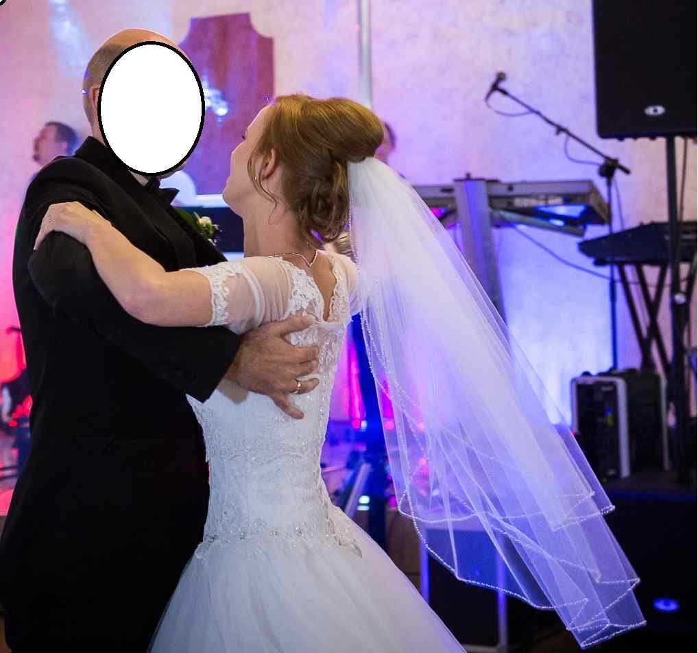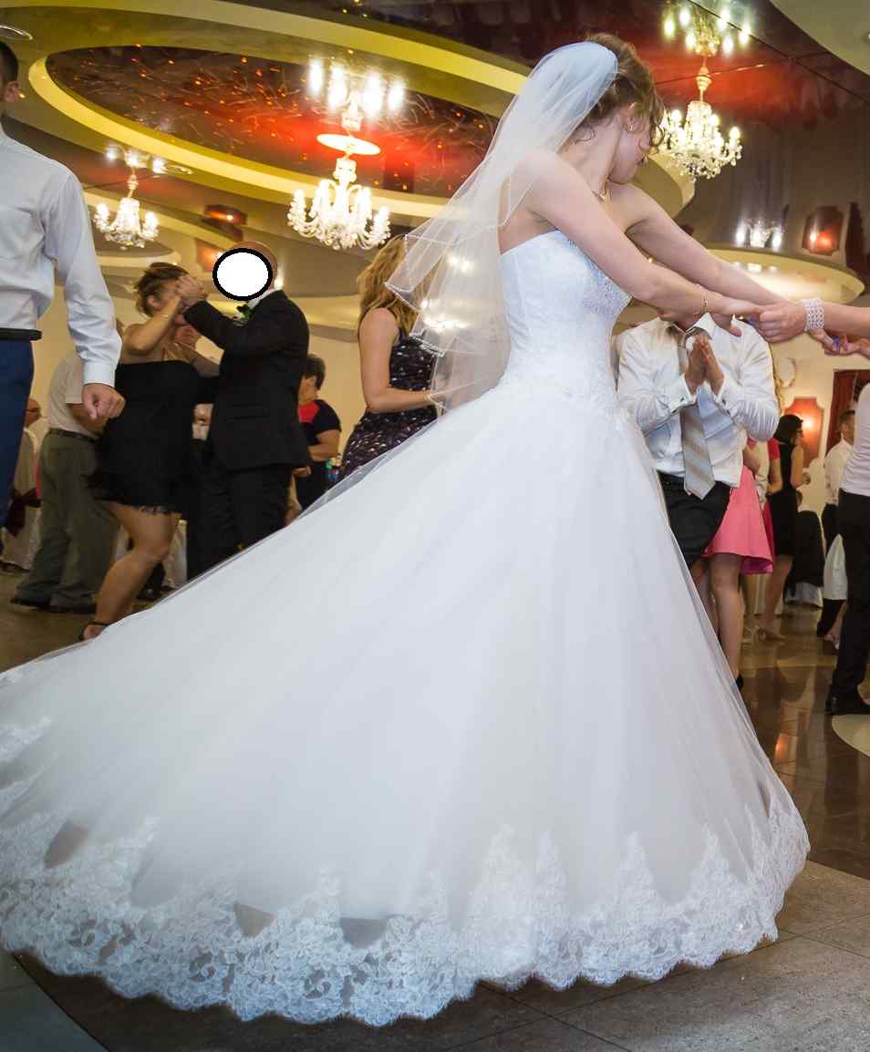 Górna część jest pięknie ozdobiona koronką i delikatnymi kryształkami z dekoltem w "serduszko". Dół to 5 warstw tiulu gdzie ostatnia warstwa ma na dole piękne koronkowe wzory. Dodatkowo dorzucam bolerko wykonane z tej samej koronki, 3/4 rękawek, krótki welon oraz koło. Cena sukni w salonie 3000 zl.