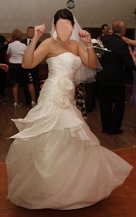Sukienka jest w bardzo dobrym stanie, noszona tylko w dniu ślubu, nie robione były w niej zdjęcia plenerowe, ale oczywiście wymaga prania przed samym ślubem przyszłej Panny Młodej.