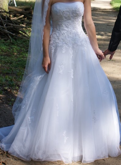 Opis: Jest to suknia stworzona dla marzycielki, która pragnie poczuć się prawdziwą księżniczką u boku swojego księcia w tym wyjątkowym dniu. Suknia ma klasyczny krój uwydatniający walory kobiecej talii. Romantyczny gorset wiązany z tyłu gładką tasiemką, ozdobiony jest koronkami i koralikami, które płynnie przechodzą na tiulową spódnicę. Zwiewna tiulowa spódnica posiada długi tren, który robi spektakularne wrażenie podczas "spaceru" panny młodej do ołtarza. Do sukni dołączona jest halka, która zastępuje koło. Fason halki został szczegółowo dobrany do kroju sukni (-góra z gładkiego materiału, -dół z tiulu). Dzięki halce suknia perfekcyjnie się układa. Suknia dodatkowo posiada możliwość podpięcia z tyłu tiulowej kokardy, która dodaje jej bajkowego czaru.