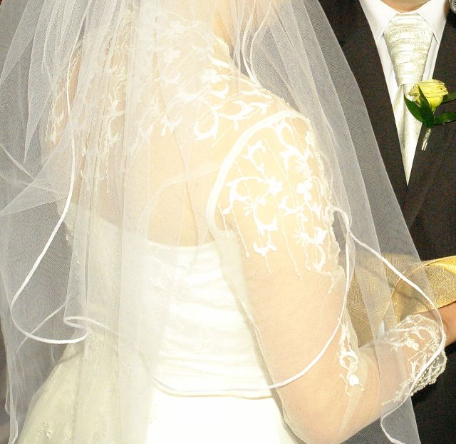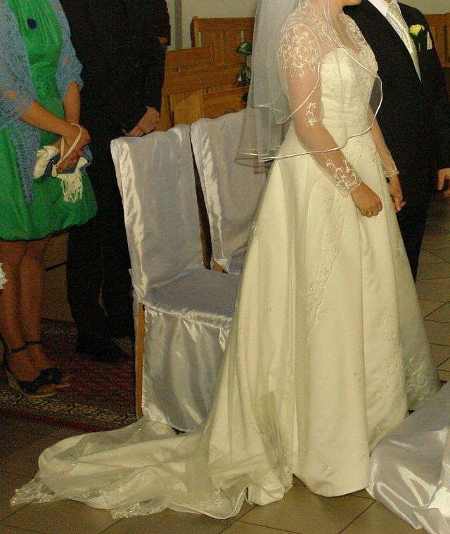 Jasno-kremowa, skromna, cała pokryta drobnymi haftowanymi kwiatkami (rewelacyjny efekt w ultrafiolecie), doczepiane ramiączka, tren z możliwością jego podwiązania pod suknią.