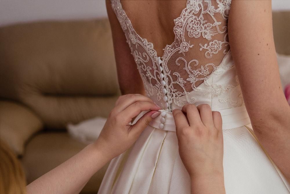 Góra sukni jest wszywane delikatne koraliki, które przepięknie mienią się w świetle.