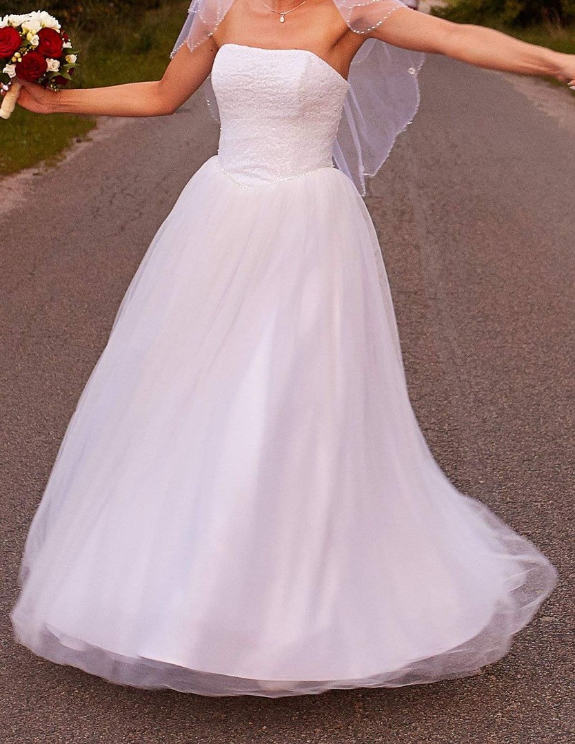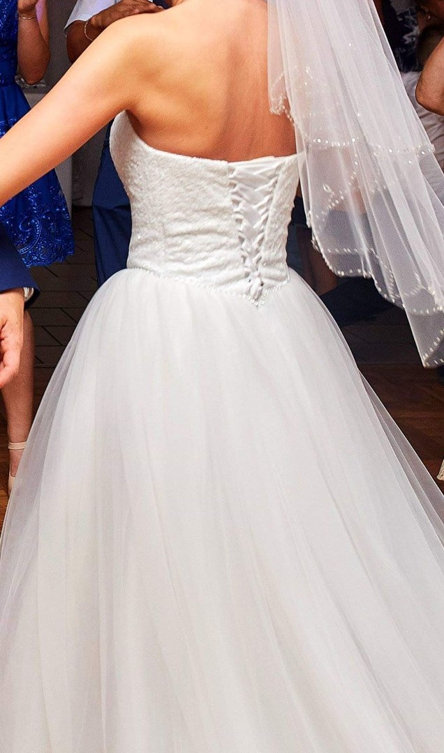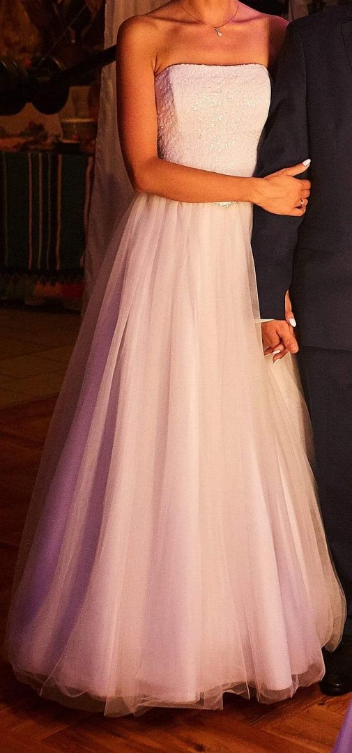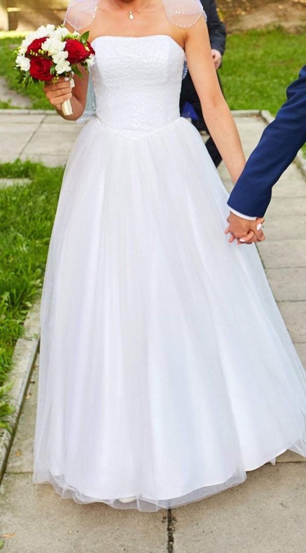 Sprzedam tiulową suknię ślubną z wiązanym gorsetem pokrytym cekinami ( wzrost 167 cm + obcas 5 cm ). Kolor biały. Do sukni dołączona jest halka, koło oraz pokrowiec. Suknia użytkowana tylko w dniu ślubu i podczas pleneru zdjęciowego, wyprana chemicznie. Odbiór osobisty, cena do negocjacji.