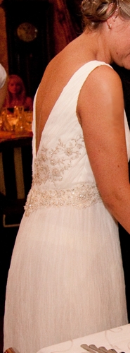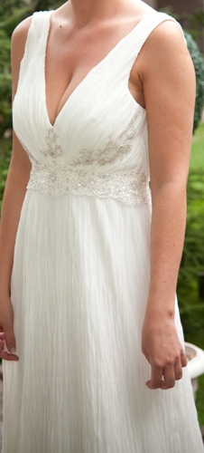 Piękna suknia ślubna w kolorze śmietankowym , przepięknie wyszywana koralikami delikatnie na biuście i pod , tył wycięty również wyszywany. Plisowana , zwiewna i delikatna. Bardzo elegancka.