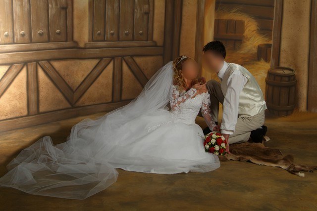 Witam serdecznie. Chciałam Państwu zaprezentować przepiękną suknię ślubną o nazwie Miracle, którą zakupiłam w firmowym salonie Pronuptia Paris. Sukienka jest niezwykle oryginalna i niepowtarzalna wykonana z tkanin najlepszej jakości. Jest jednoczęściowa, śnieżno biała, z haftowanymi kwiatami, listkami i koralikami. Ma długie szyfonowe, również haftowane rękawy oraz duży dekolt w stylu carmen. Dolna część sukienki składa się z kilku na siebie naszytych warstw tiulowych, co powoduje, że sukienka jest niezwykle lekka i wygodna. Halka sukienki składa się z kilku falban szyfonowych a nie sztywnych kół. W komplecie do sukienki poza halką, oryginalnym pokrowcem jest welon pokryty potocznie nazywanymi kropelkami rosy. Składa się z dwóch części krótkiej do pasa oraz długiej z trenem. Całość pięknie prezentuje się w kościele oraz na zdjęciach. Podczas uroczystości weselnej można odpiąć część długą z trenem. Welon krótki do pasa składa się z warstw różnej długości i jest również dedykowany dla tej sukienki, dlatego też samodzielnie wygląda równie zjawiskowo jak z trenem, a jest o wiele wygodniejszy zwłaszcza podczas tańczenia.