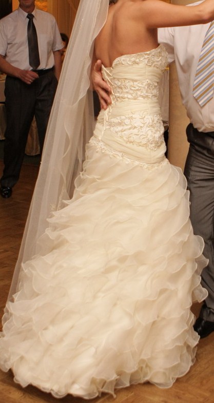Przepiękna suknia kolor golden, zdobiona złotym haftem.Zrobiłam w niej ogromne wrażenie na mężu i gościach:)Suknia wiązana z tyłu tasiemką z zabudowaną patką dzięki czemu łatwo można ją dopasować do każdej sylwetki. Jest bardzo lekka i zwiewna, nie utrudnia chodzenia i zapewnia pełną swobodę w tańcu.