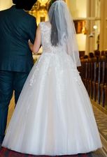 Suknia ślubna w kolorze ecru z delikatnym odcieniem brzoskwiniowym, góra sukienki zdobiona aplikacjami z subtelnymi lecz mieniącymi się koralikami i cekinami, dół spódnicy nienachalnie błyszczący tiulem z brokatem.