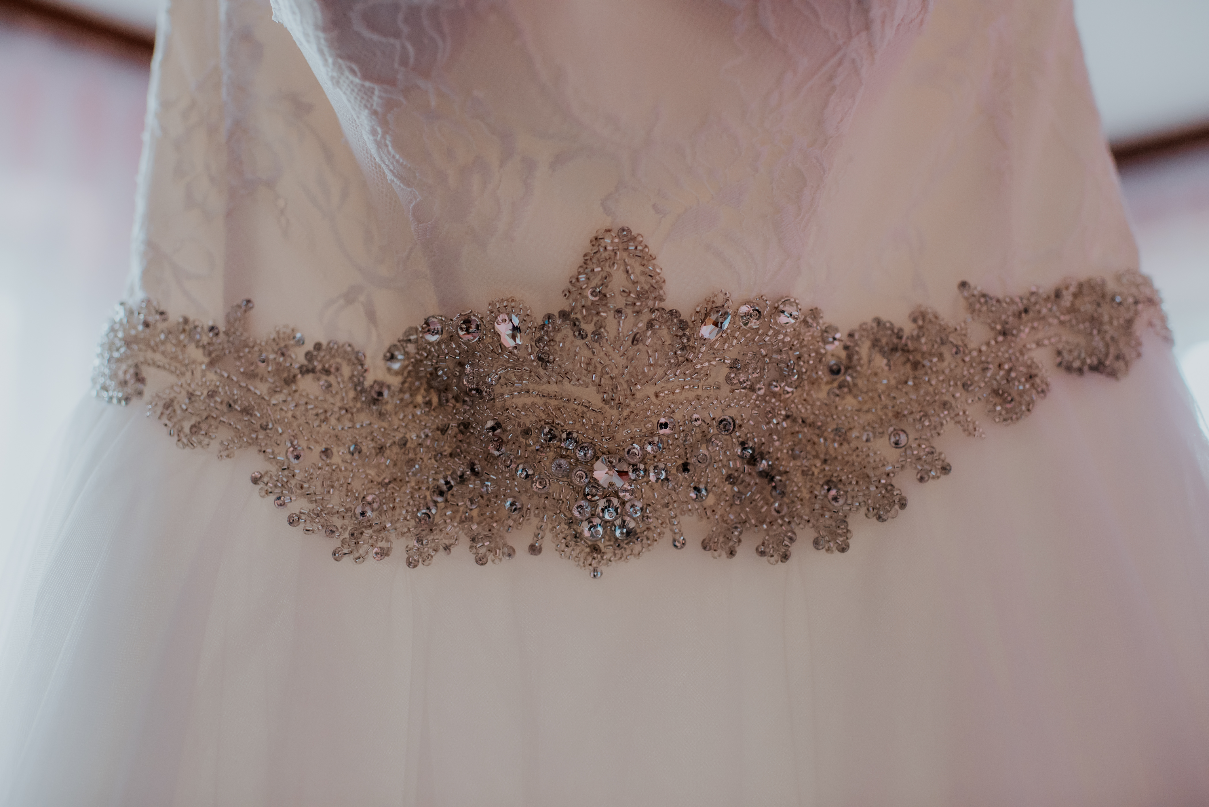 Spódnica vapory i sukienka są wyszywane z bajecznej koronki włoskiej i ręcznie wykonana taśma wykonana jest z musujących kamieni.
