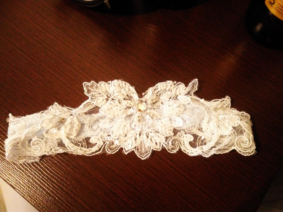 Wraz z suknią oferuję Państwu (wszystko w jednej cenie) podwiązkę oraz delikatną koszulkę z dekoltem wykończonym koralikami imitującymi perełki.
